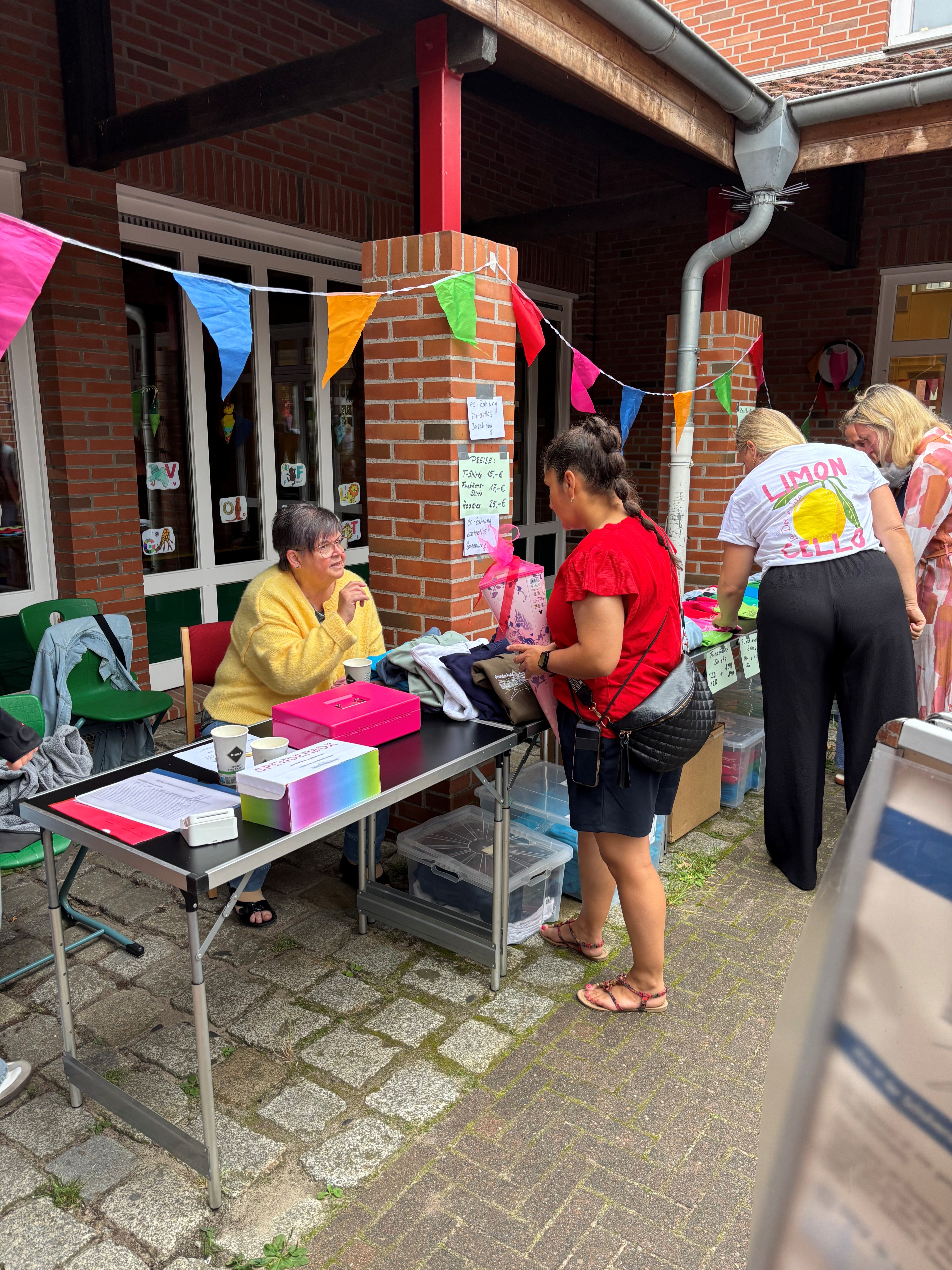 Hier sind Menschen zu sehen, die den Stand des Schulvereins betreuen.