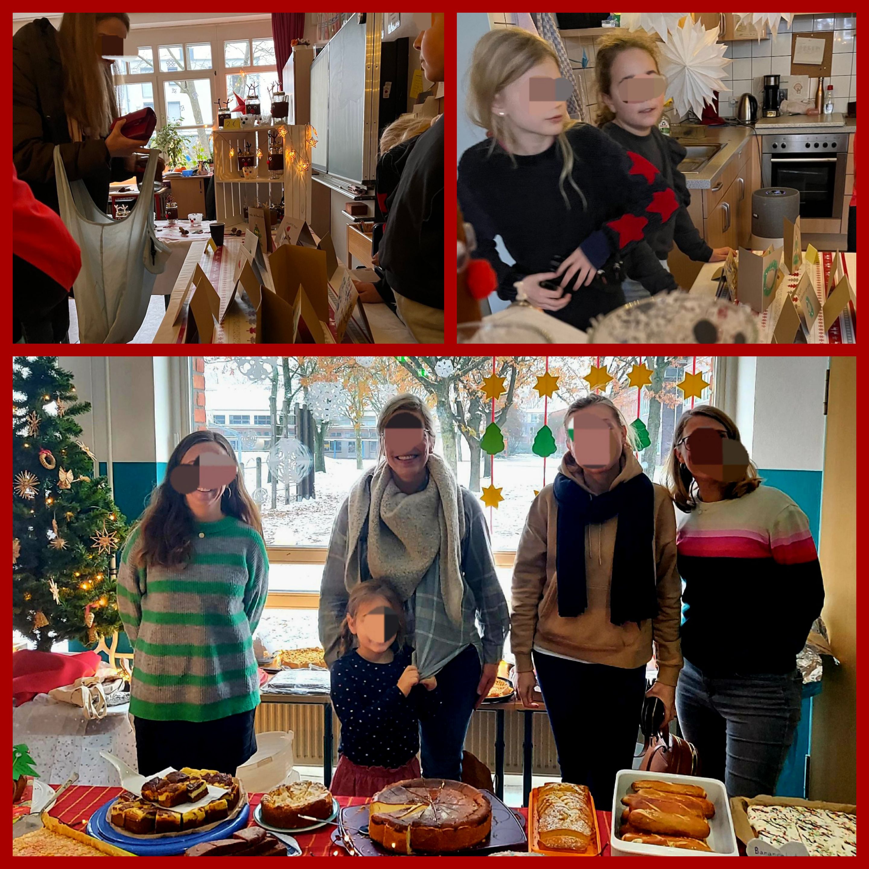 Hier ist eine Fotocollage zu sehen, auf der Eltern und Kinder beim Verkauf auf dem Weihnachtsbasar zu sehen sind.