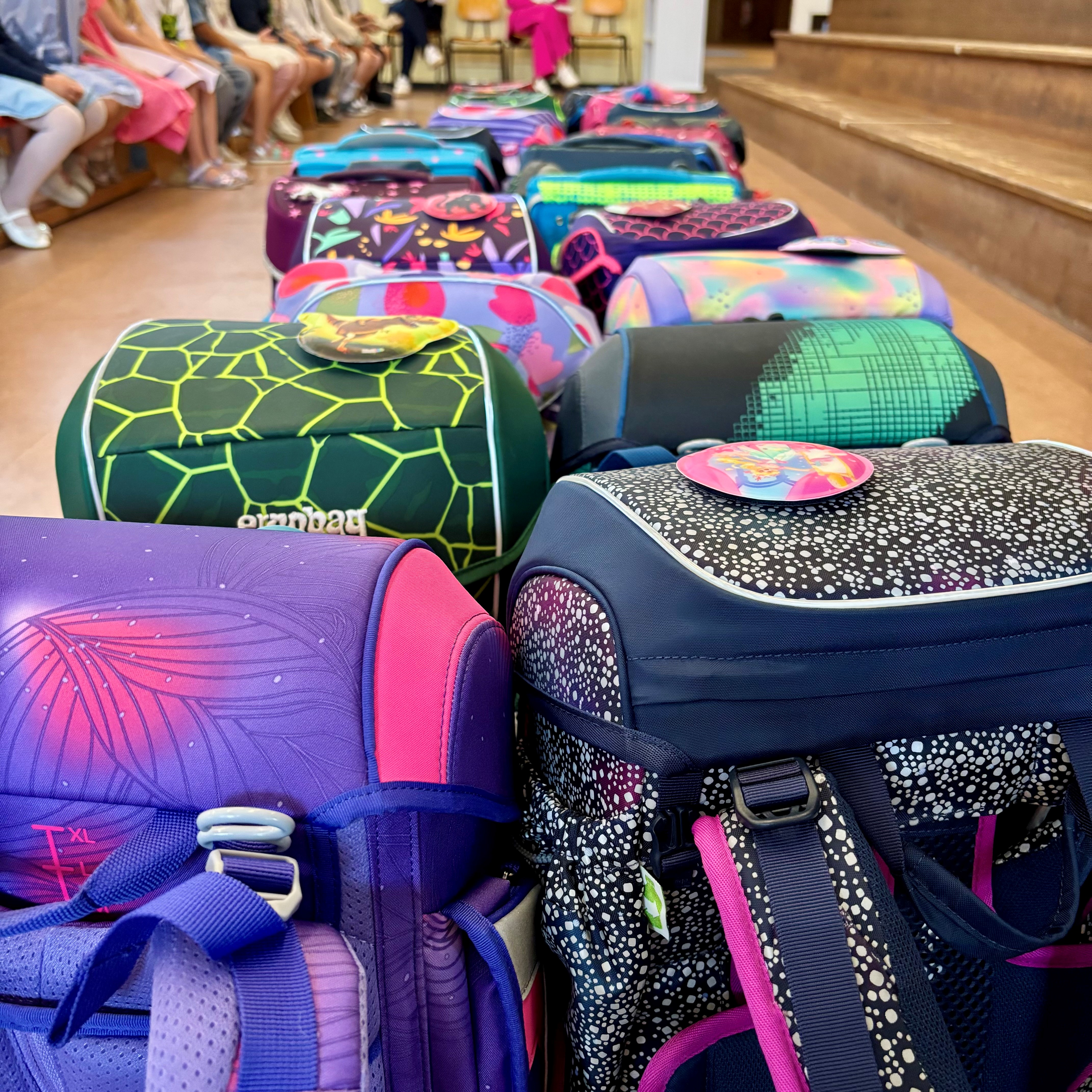 Hier sind viele Schulranzen zu sehen.
